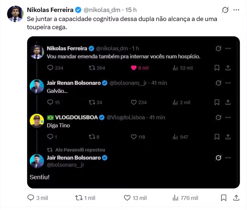A polêmica teve início quando Nikolas Ferreira respondeu a uma provocação feita por um influenciador alinhado ao bolsonarismo. Após a interação, Jair Renan Bolsonaro comentou a publicação com uma expressão irônica, o que motivou uma resposta direta do deputado.